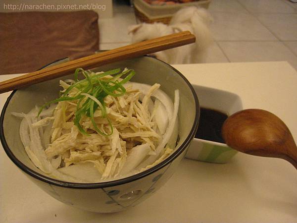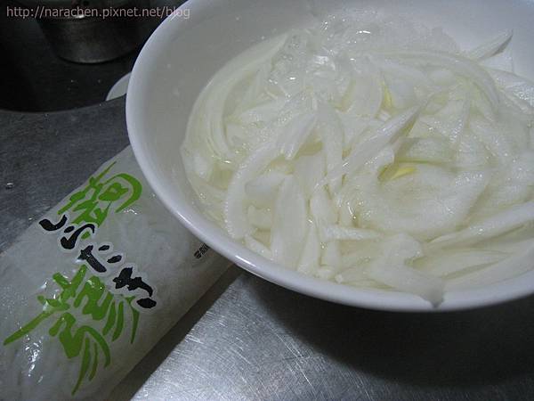 洋葱切絲放冰水~ 金針菇燙好放冰水~蒟蒻麵燙過放冰水